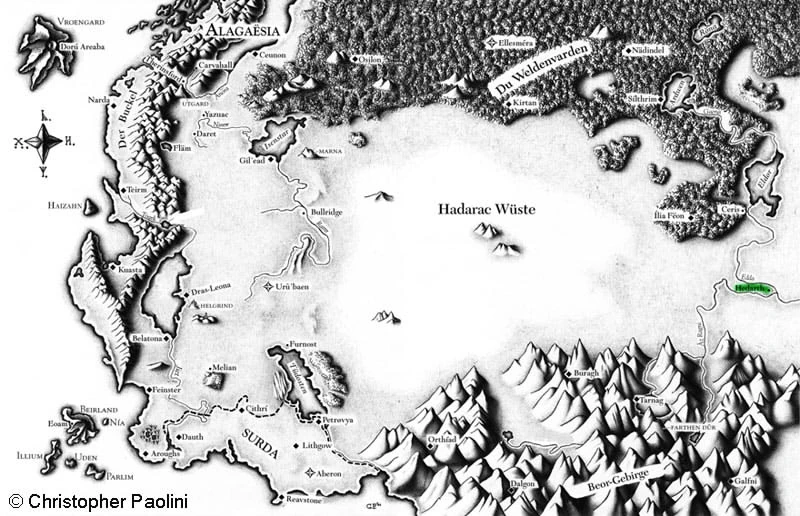 Eragon und Saphira, in Begleitung von Arya, Orik und einigen weiteren Zwergen, passieren Hedarth auf dem Weg von Tronjheim nach Ellesméra. Sie tauschen hier ihre Boote gegen Esel ein. Außerdem ist Hedarth Eragons und Saphiras letzter Aufenthaltsort bevor sie am Ende des vierten Buches die bekannte Welt für immer verlassen.