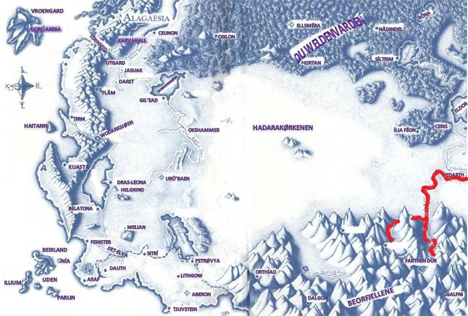 | Lokasjon | Fra Beorfjellene og videre nordover, for å svinge østover |